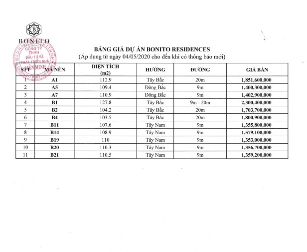 Giá bán dự án Bonito Residences